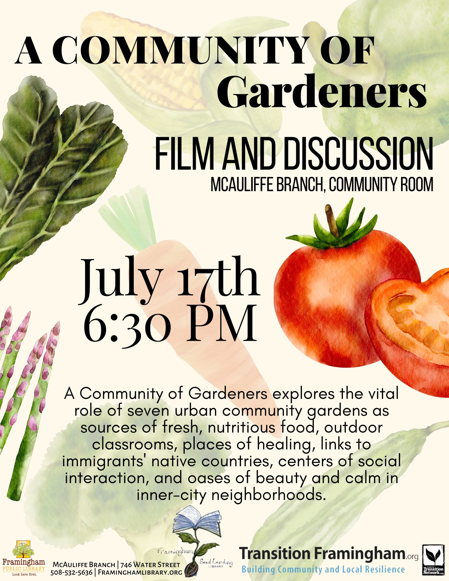 Join us for a screening of this film followed by a panel discussion to hear from members of several community gardens in Framingham! This event is co-sponsored by the Framingham Seed Lending Library, and the Framingham Community Gardens Working Group, a project of Transition Framingham.