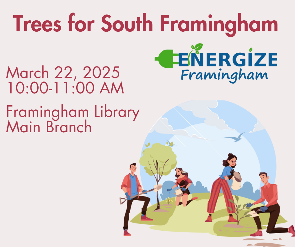 Energize Framingham is gathering people interested in adding trees to “heat island” areas – those that lack sufficient tree cover – to discuss strategies, solutions, and next steps. All are invited, especially potential partners and volunteers who are part of the South Framingham communities, could potentially provide funding or saplings and/or are experienced in logistics. Volunteers will also be needed to help map eligible streets to prioritize for tree planting, plant the trees, educate residents on caring for the trees, and other kinds of support.