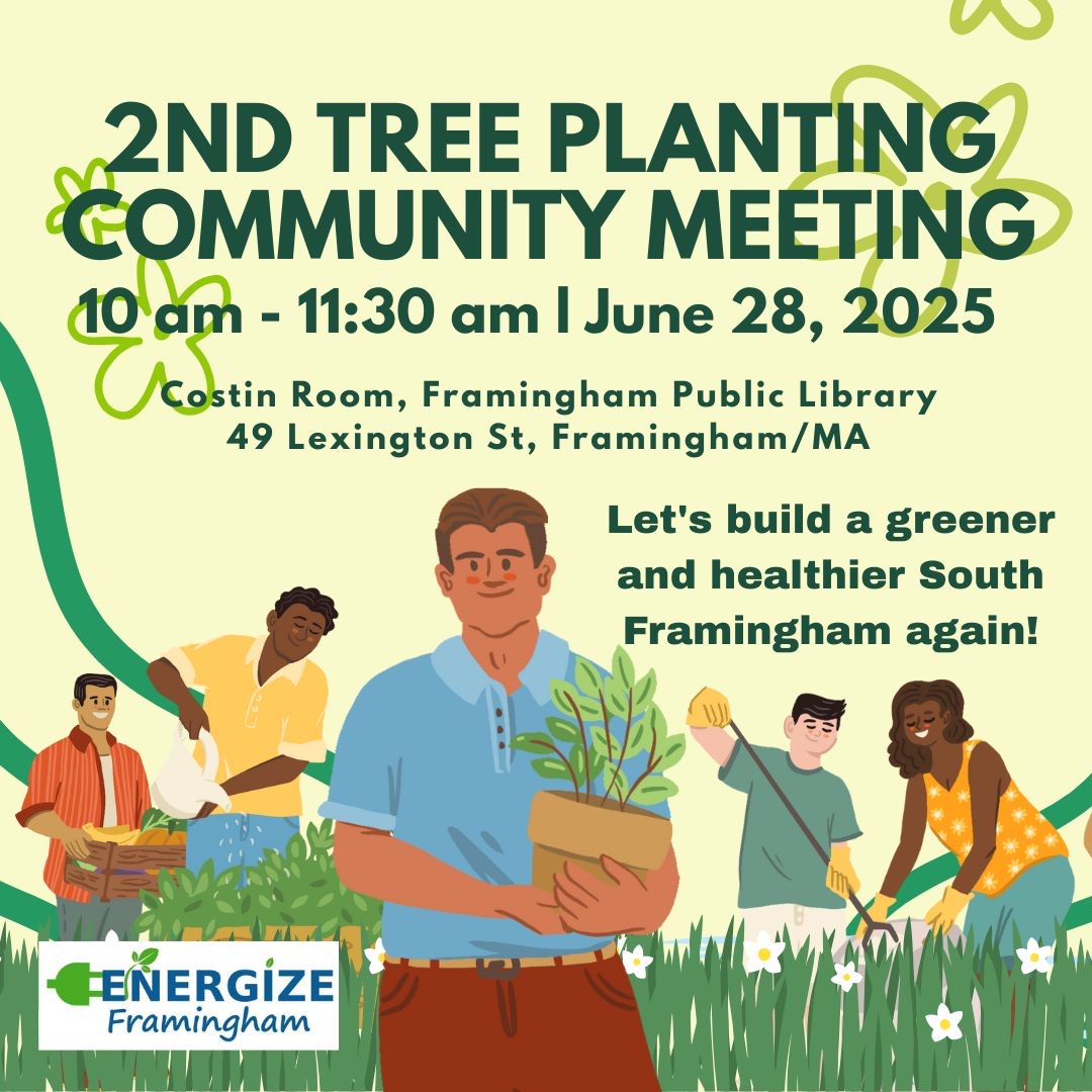 Energize Framingham’s newly formed Tree Equity Action group is meeting as a follow-up to the March meeting (see our April issue for details).