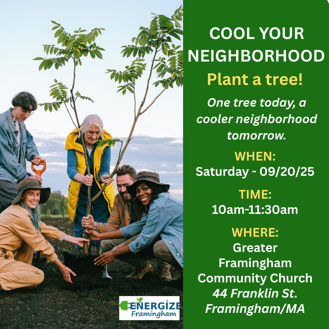 Want to see Framingham’s hot areas get cooler? Join us to hear more about our partnership with the Framingham Public Schools and the Tree Warden to plant trees at several schools and in heat zones around the city. All are welcome — we need your help!