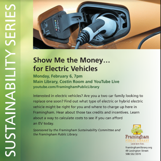 Learn about a way to calculate costs to see if you can afford an electric vehicle. Find out what type of electric or hybrid electric vehicle might be right for you where to charge up here in Framingham. Hear about those tax credits and incentives.