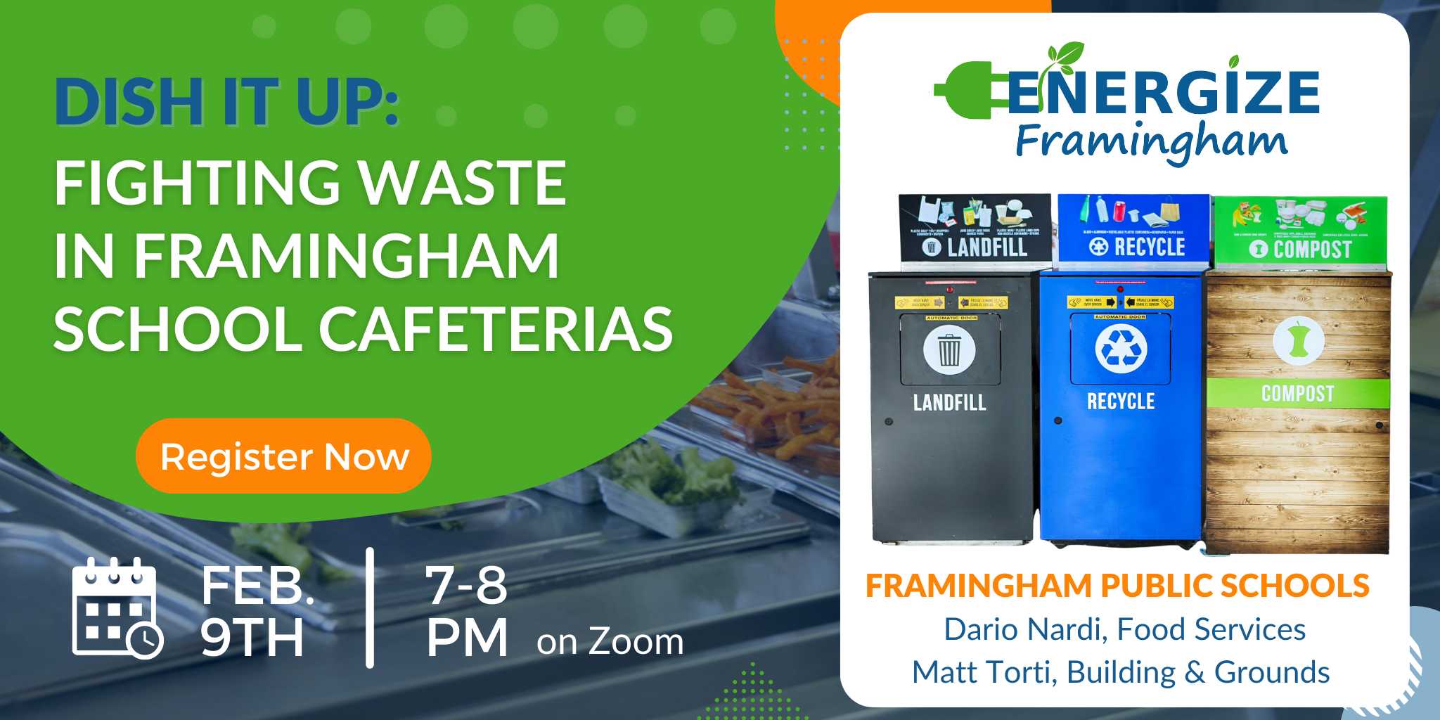 Hear from Dario Nardi of food services and Matt Torti of building and grounds from Framingham Public Schools. They will be speaking about food waste, composting and recycling in the Framingham school cafeterias.